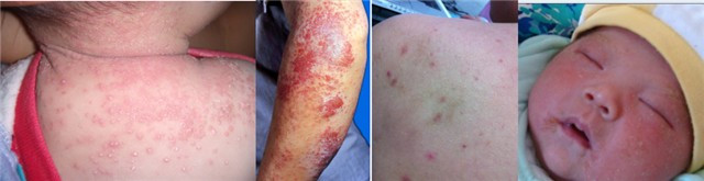 (1)急性湿疹:发病急,常呈对称分布,以头面、四肢和外阴部好发。在病程发展中,红斑、丘疹、水疱、脓疱、糜烂、结痂等各型皮疹可循序出现,但常有2-3种皮疹同时并存或在某一阶段以某型皮疹为主。常因剧烈瘙痒而经常搔抓,使病情加重。