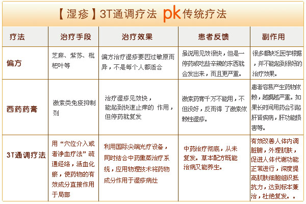 “3T通调疗法”根据中医“病在肌肤,根在血液,治血必治脏”的理论,采用医外治法(穴位介入、净血疗法)、免疫调节系统和中药熏蒸法完美融合的中医治疗理念,采用现代生物工程技术与中医的草本化和西医的现代化联合应用。针对各种不同原因所致的皮炎、湿疹、荨麻疹,采用个性化临床治疗方案,可以彻底治疗各种皮炎、湿疹、荨麻疹。