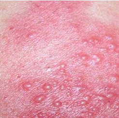 5、发病区皮肤丘疹呈带状排列,沿一侧周围神经节分布区出现,继而在红斑上生成簇状米米粒至绿豆大小的丘疱疹,并迅速变为水疱,渐渐变为血疱乃至脓疱,最后覆盖有坏死性痂皮。