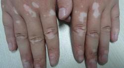 病情描述:手指、脚背、前胸皆大面积白斑,皮损严重,尤其是面部直接影响了他的心理健康,平时不愿意社会交往,自卑、孤独、封闭,思想压力重、沉没寡言。