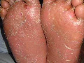 仅局限于手上和足底部位的掌跖牛皮癣,皮损边界清楚的角化斑片,中央较厚,边缘较薄,斑上可有点状白色鳞屑或点状凹陷,有时因皮损较厚而引起皲裂。这寸要与手足癣相鉴别。