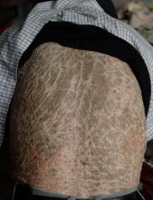 今年五月份的时候,在南昌打工的儿子听说南昌中山皮肤病医院治愈了很多鱼鳞病,于是把我带到了南昌中山皮肤病医院求医。皮肤科专家沈主任接诊后,检查时看到老人家全身表皮呈黑褐色鱼鳞状,一块块地裂开,就像龟裂的老树皮。张老伯告诉沈主任,这个病年年发作,瘙痒难耐,真是苦不堪言啊。