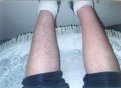 皮肤紫癜对称分布,分批出现,反复发作于四肢及臀部,尤以双下肢伸侧为甚,少数累及面和躯干部。紫癜出现前可有皮肢瘙痒,随后出现小型荨麻疹或红色圆型丘疹,高出皮面,颜色逐渐增深,呈现紫红色,压之不退色。重者可发生水疱、溃疡及局部坏死。个别病例可伴有荨麻及血管神经性水肿,后者多发生于头面部。