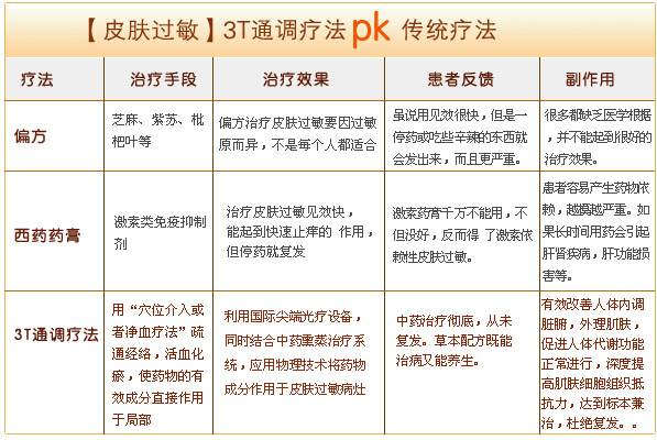 南昌中山皮肤病医院自主研发的“中西医结合3T通调疗法”,发挥中医标本兼治的优势,采用内服特制中药、外部中药薰蒸治疗,多效并举,抗炎修复,光洁皮肤,安全无害,从源头入手,清除过敏原,有效治疗各种过敏性皮肤病。