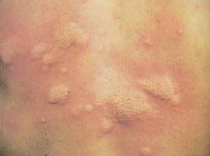 2、小丘疹及丘疱疹为常见且典型,少数患者伴随有红斑水肿或斑块。病情受日光照射影响较大。