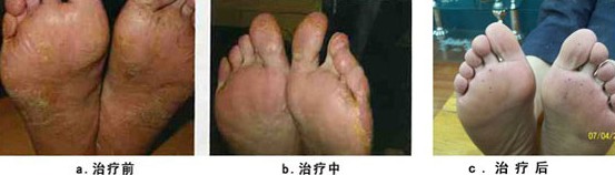 庄先生,39岁,山东人,患有脚气(足癣)半年多,一年前一次洗脚时发现脚底有几个小暗红点,不疼不痒,当时没太注意,以后小红点开始扩散,出现针尖到针 头大小的深在水疱,并且开始发痒。后到当地皮肤病医院,当地大夫诊断为:掌趾脓疱病,给予药膏治疗,用了之后有所见效,心里非常高兴;可是没过几天就又复 发了,接着抹药膏;就这样反反复复,最后抹药膏也不管用了,而且面积也扩散了,非常痒,越痒越抓,越抓越痒,经常挠的出血也不解恨,尤其是到晚上痒的厉 害,严重影响了睡眠质量,实在是痛苦!患者为我院专家送来锦旗表示感谢在南昌打工的他,经同事介绍说南昌中山皮肤病医院对治疗各种顽固性皮肤病效果 好,而且治愈后不易复发,于是来到医院。
