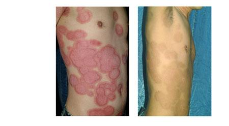 疾病治疗:南昌中山皮肤病医院专家诊断为玫瑰糠疹,采用我院的“中西医结合解毒健肤疗法”进行治疗,一个疗程之后,患者脸上的皮肤恢复正常,彻底痊愈。