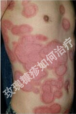 表现症状:身起了很多大红点,肚子前面也长了一块一块的红斑,起初还以为是长癣了,不痛也不痒,还有发低烧、有头痛、咽喉痛、四肢关节酸痛等症状。