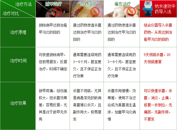 国家医药卫生部门与消费者权益部门在2014年4月下发通知文件,委托《消费者权益报》开展了真菌性皮肤病同类技术治疗普查活动。本次调查共涉及治疗方面的药物和技术百余种,其中以“纳米速效离子导入疗法”为主在疗效及预后方面独占鳌头,获得众多专家的认可。纳米速效离子导入疗法通过强力渗透、彻底杀菌、持续免疫、一次治愈不复发四大步骤,对症治疗,彻底治愈甲沟炎,真正实现一次治愈永不复发。