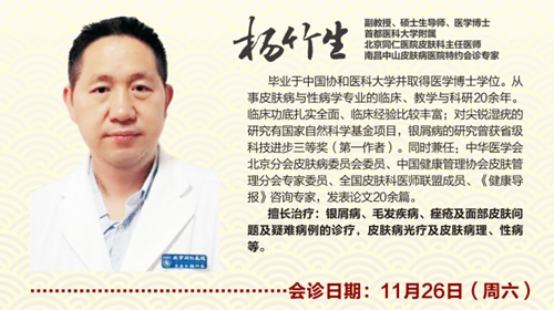 - 上一篇:11月26日 首都医科大学附属北京同仁医院皮肤科主任医师、副教授、医学博士、硕士生导师杨竹生莅临我院会诊
